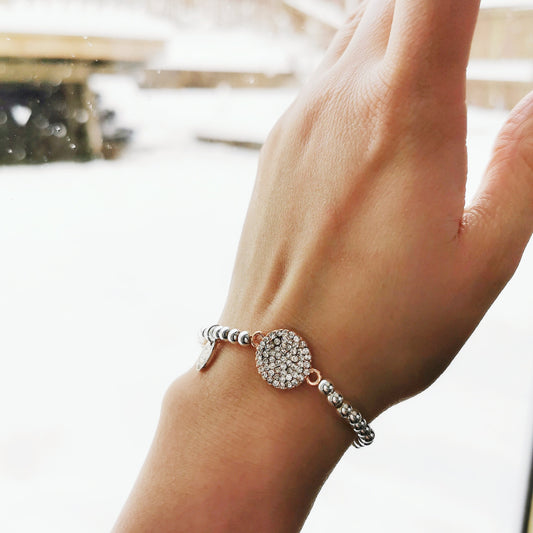 Fabulous Teacher Bracelet /Silver Beads Bracelet with Rose Gold Crystal Pave Disc Symbol Charm / Gift For Teacher / Best Teacher Gift