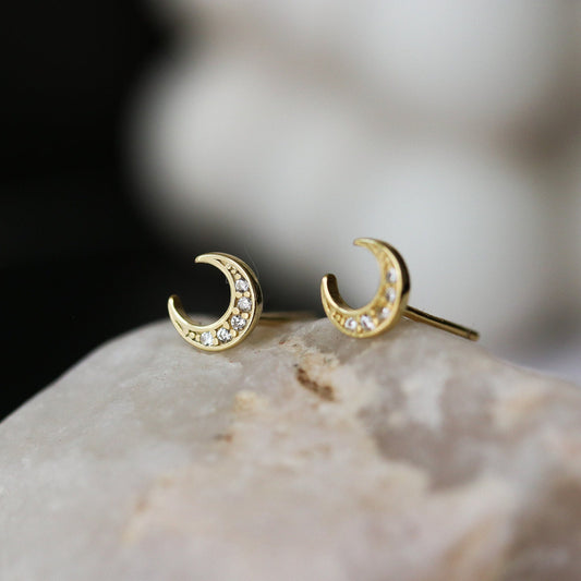 Tiny CZ Pave Crescent Moon Earrings, Gold Silver Stud Earrings, Sparkly Diamante Studs, Dainty Minimalistic Womens Jewellery, Gift for Her