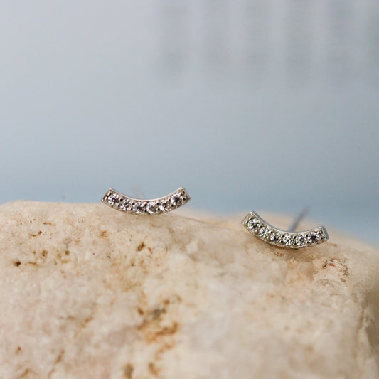 CZ Pave Curved Bar Earrings, Gold Silver Stud Earrings, Tiny Sparkly Diamante Studs, Dainty Minimalistic Womens Jewellery, Gift for Her