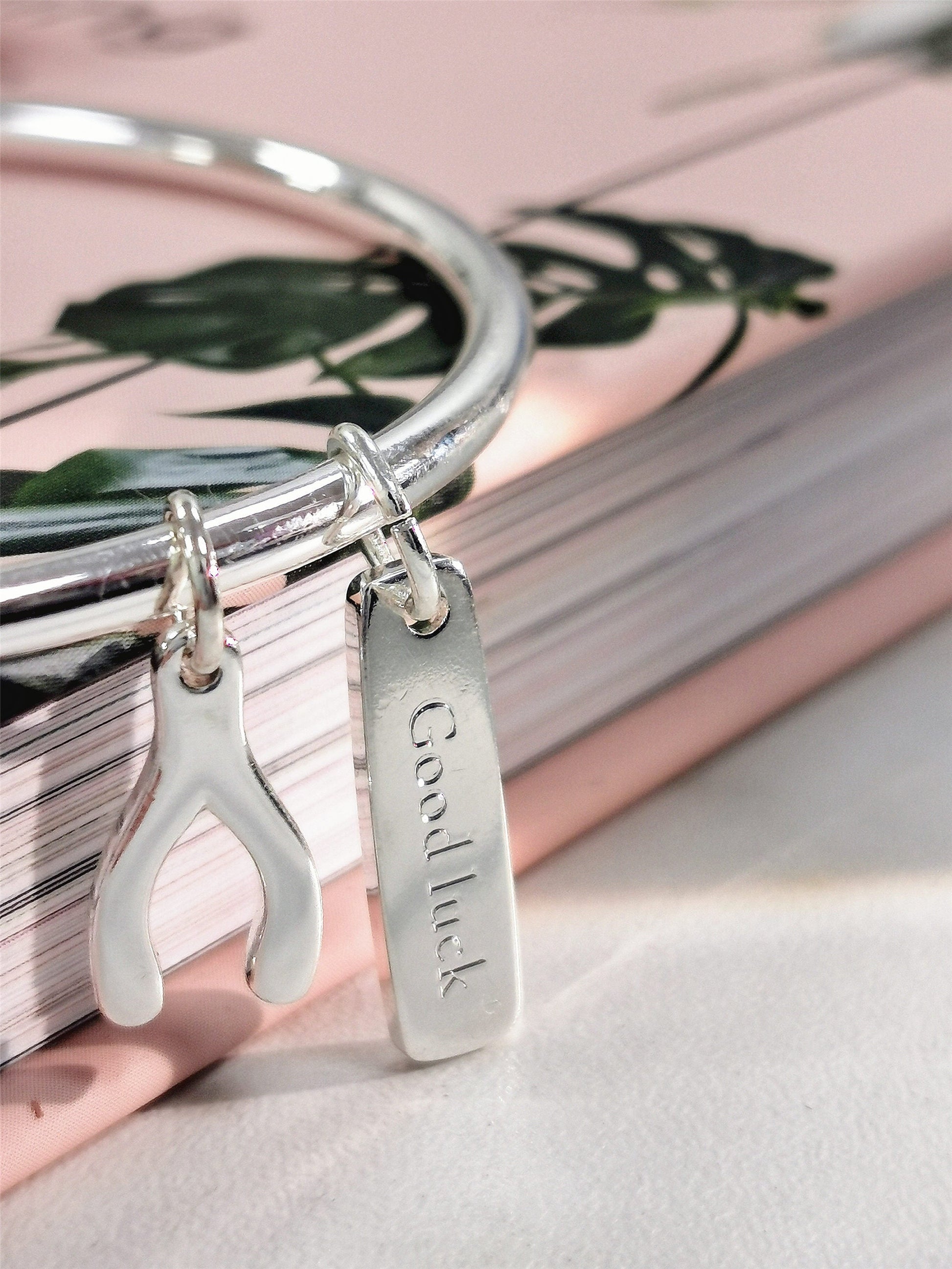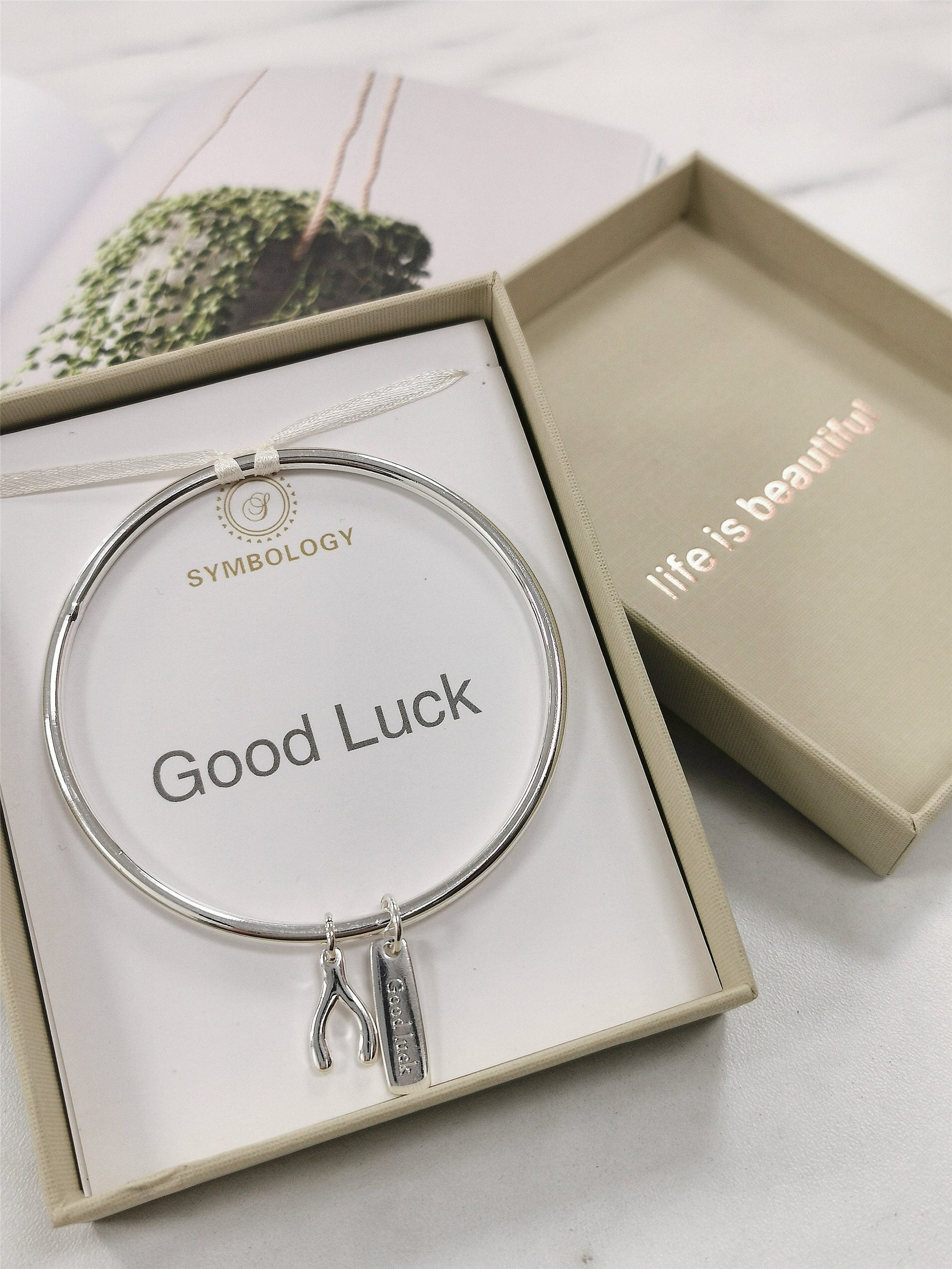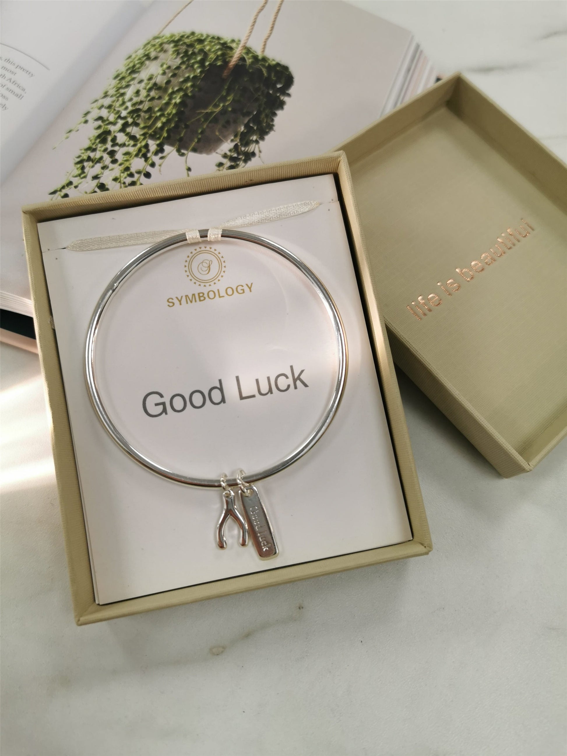 This beautiful silver plated bangle comes with a Wish Bone symbol and ' Good Luck' tag charm. It paired with a simple and beautiful card with the same message. It is both sentimental and stylish, making this the perfect gift for someone special or a treat for yourself.